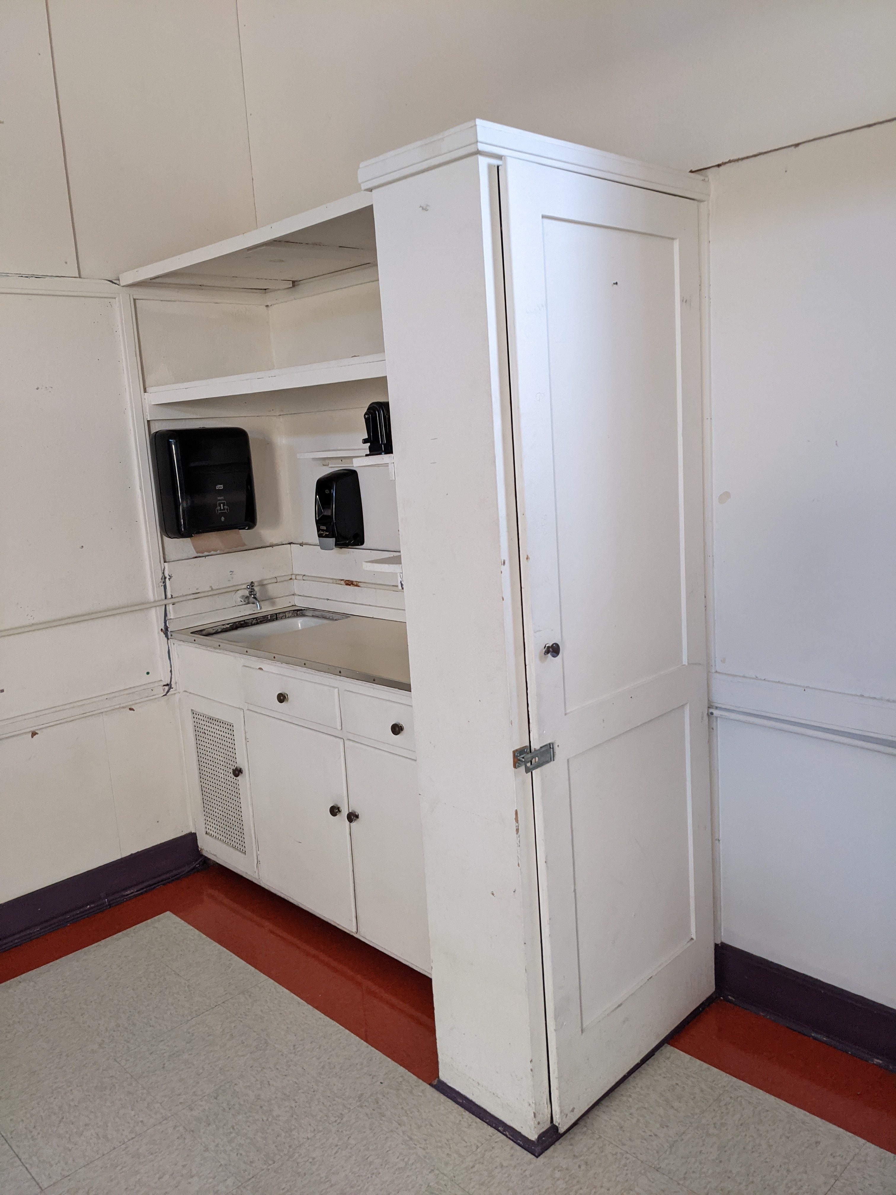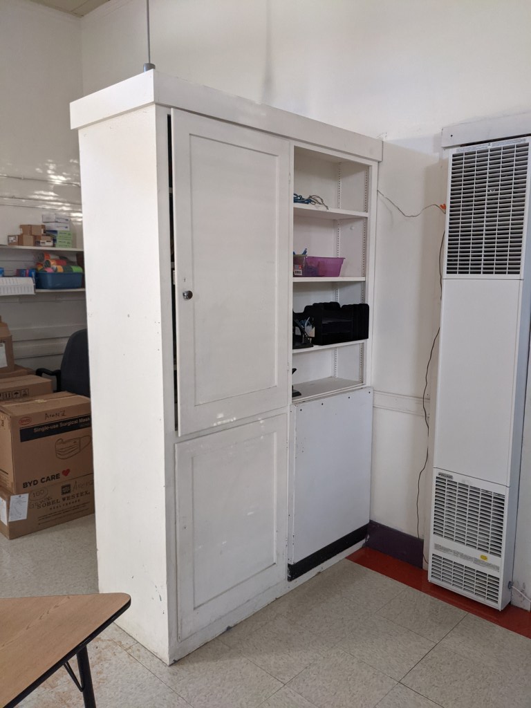Recently I had occasion to go into Room 5—currently the covid test room though it’s far larger than that activity requires—you could take a running start in socks and get a good slide down the empty floor. I saw these old built-ins and long blackboards, and decided I’d better start snapping photos before they get ripped out and replaced with modern stuff.