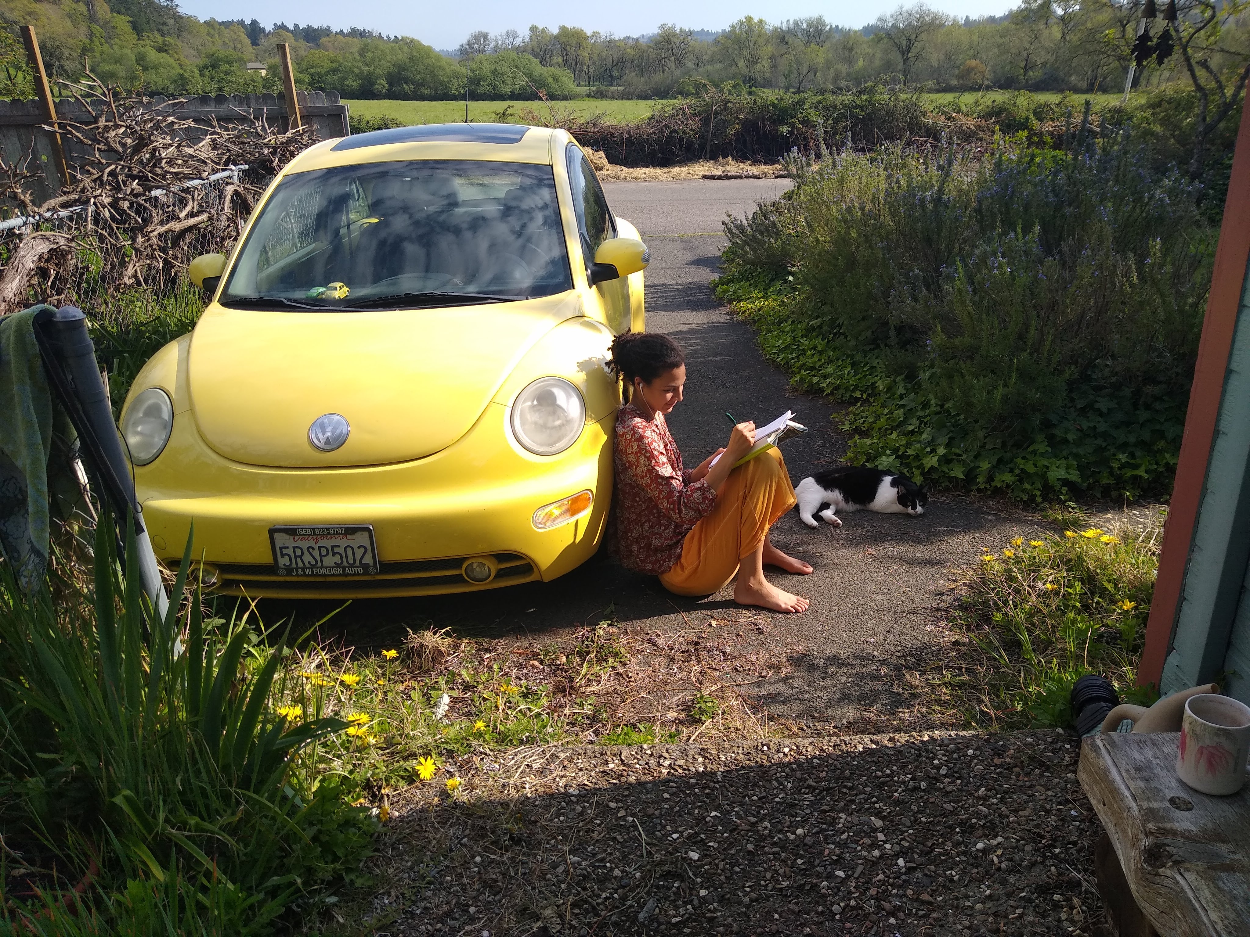 Here’s Buttercup in the country setting where I used to live, in Graton, CA, daughter catching sun, cat nearby.
