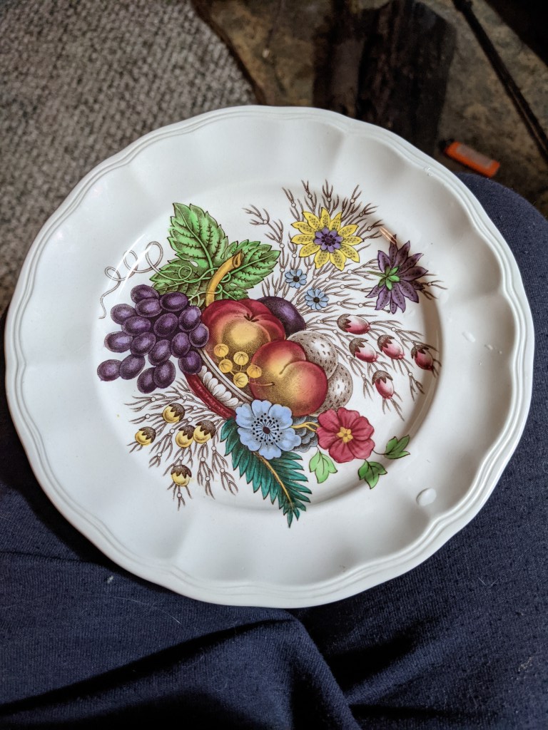 I never knew what Spode meant, but didn’t really question it. Only now, with the sight of some in pieces, did I turn an unbroken one over to find–ah ha! — the name Spode. I looked it up: “Fine pottery or porcelain made at the factories of the English potter Josiah Spode (1755–1827) or his successors, characteristically consisting of ornately decorated and gilded services.”