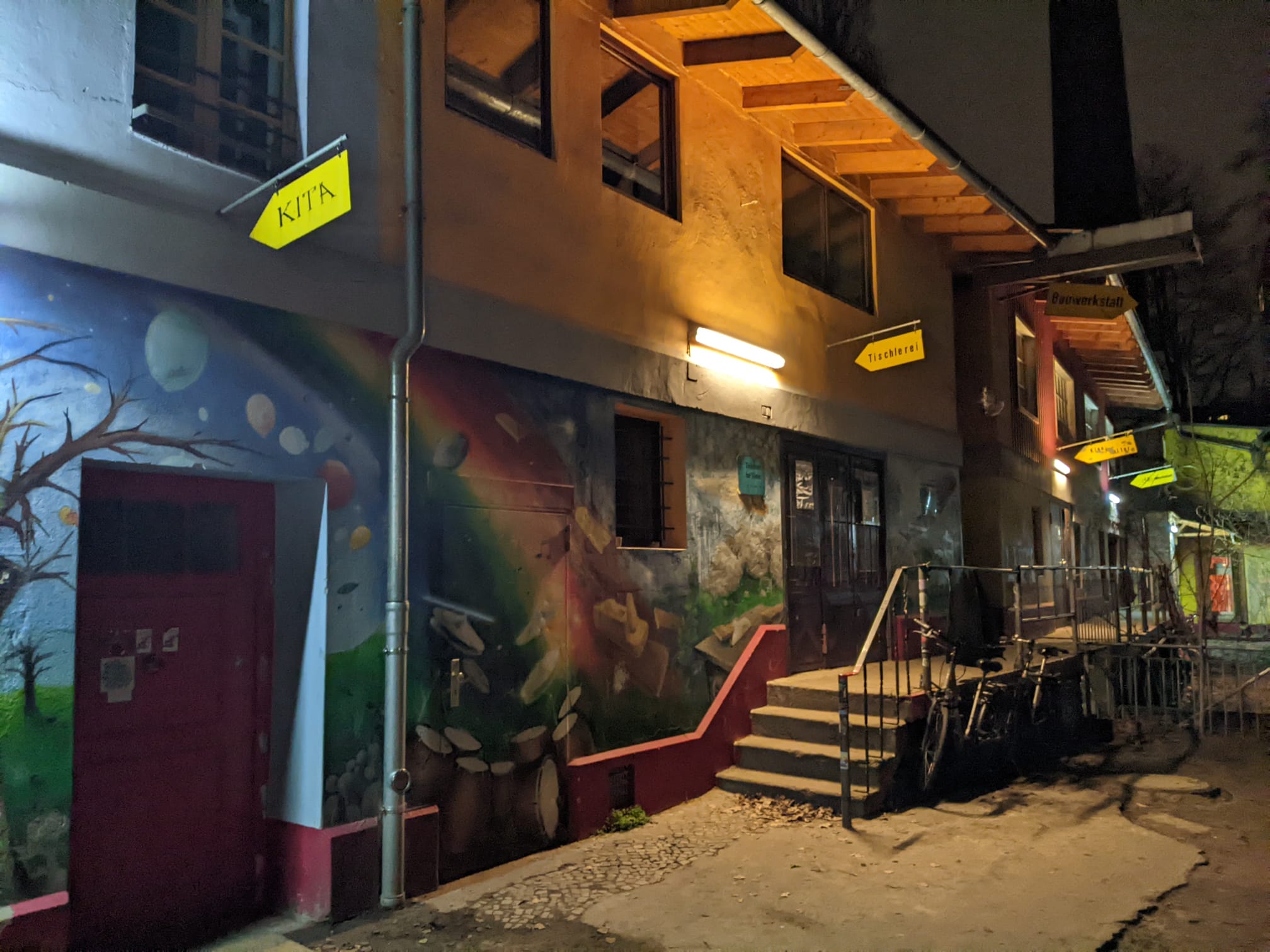 They focus on: neighborhood projects uniting all age groups; support for self-help; culture and media “from below”; connection between living, working and free time; co-operation for the handicapped, and democratic decision making structures. Cool! Hope that all stays strong! The site talks about different legal frames. Something about Kindergarten. I’ll need my daughter’s translation of the German. They hold bicycle and “carpenting” workshops as well as cultural activities. Something about a canteen and bakery, though Piper hasn’t told me about that. The cafe is run by an independently working “Wirtschaftsverein” – co-op? Worker owned? Not sure!