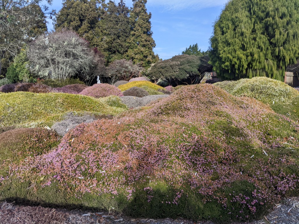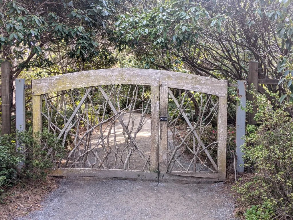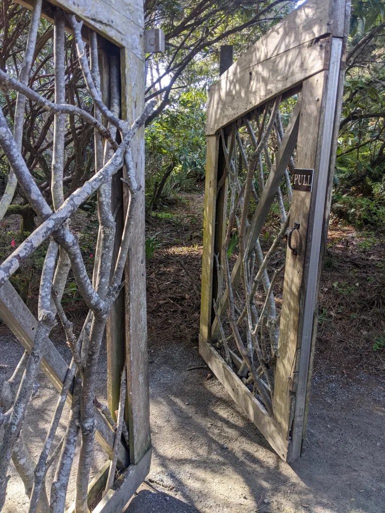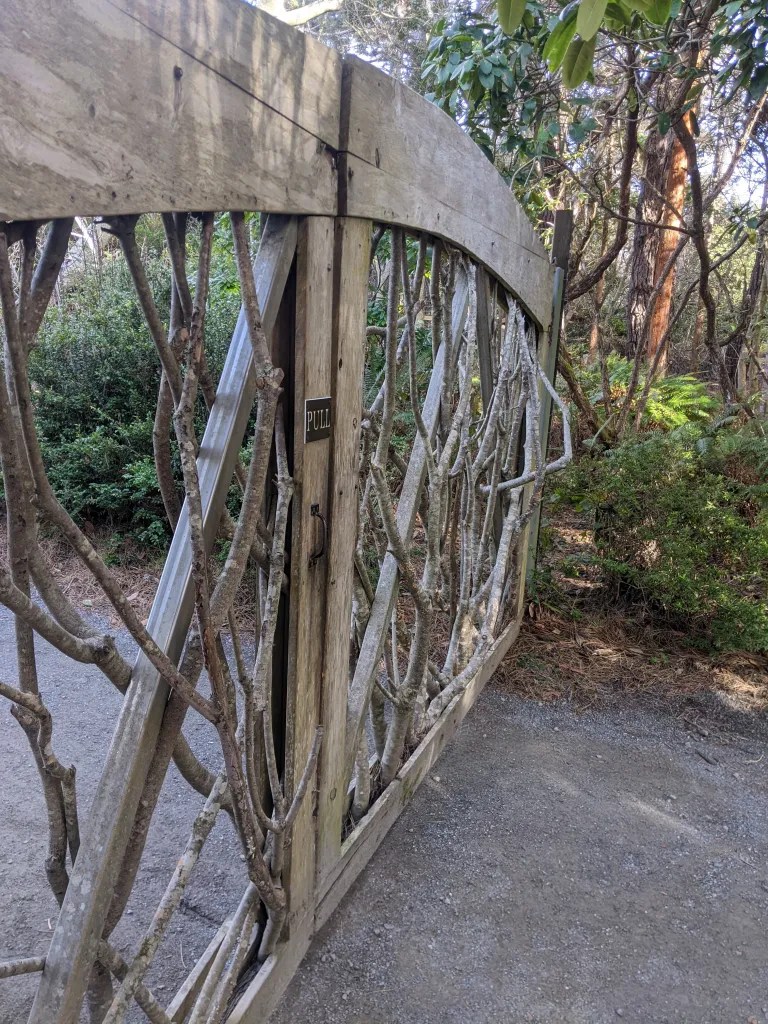We spent the most time in the Botanical Gardens, an immense sprawling property stretching to the sea, with a little fern canyon, a creek trail, model veg garden and so much more. We loved the heathers that formed a rolling terrain of multi-colored hillocks. The gate really drew me. I love wild-wood-woven fences and want to make some one day.