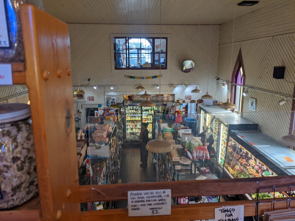 I’ve posted before about Corners of the Mouth, the health food store set in an old church in Mendocino, but here’s the interior, from the herb haven upstairs.