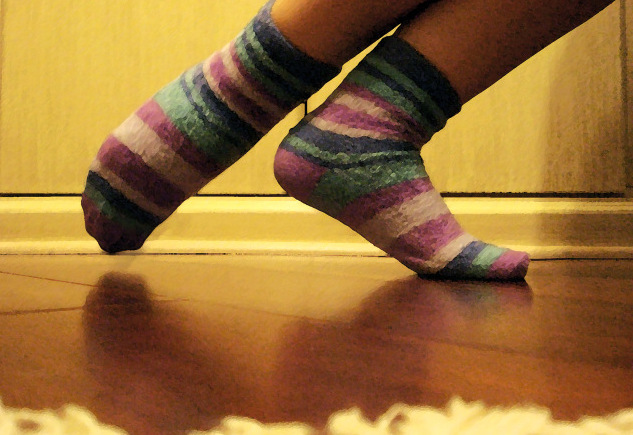 “Oh, fine.” Marci disappeared into her bedroom. She came out wearing three fluffy pairs of foot-warmer socks. “Cowabunga!!!!” she yelled, running, turning in a wide-legged slide…