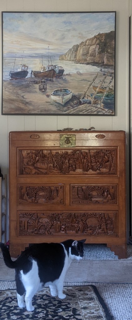 The Chinese chest was brought to the U.S. by ship with my mom’s parents, probably around 1930. It’s in my home now, under a painting by my mom. Same with the couch my sister is sitting on. I still have the lamp whose shade my mom wove.