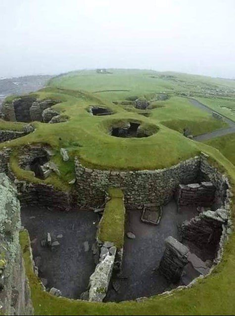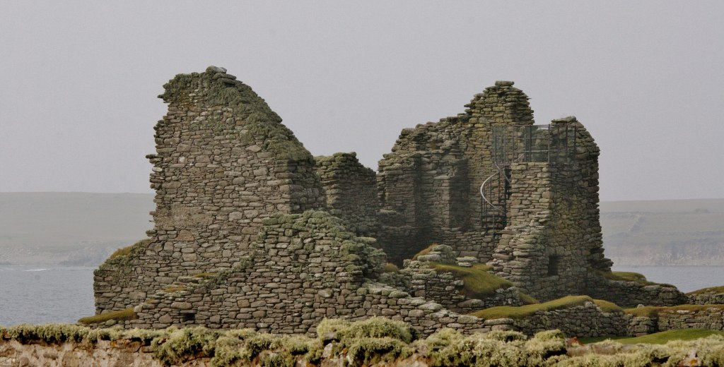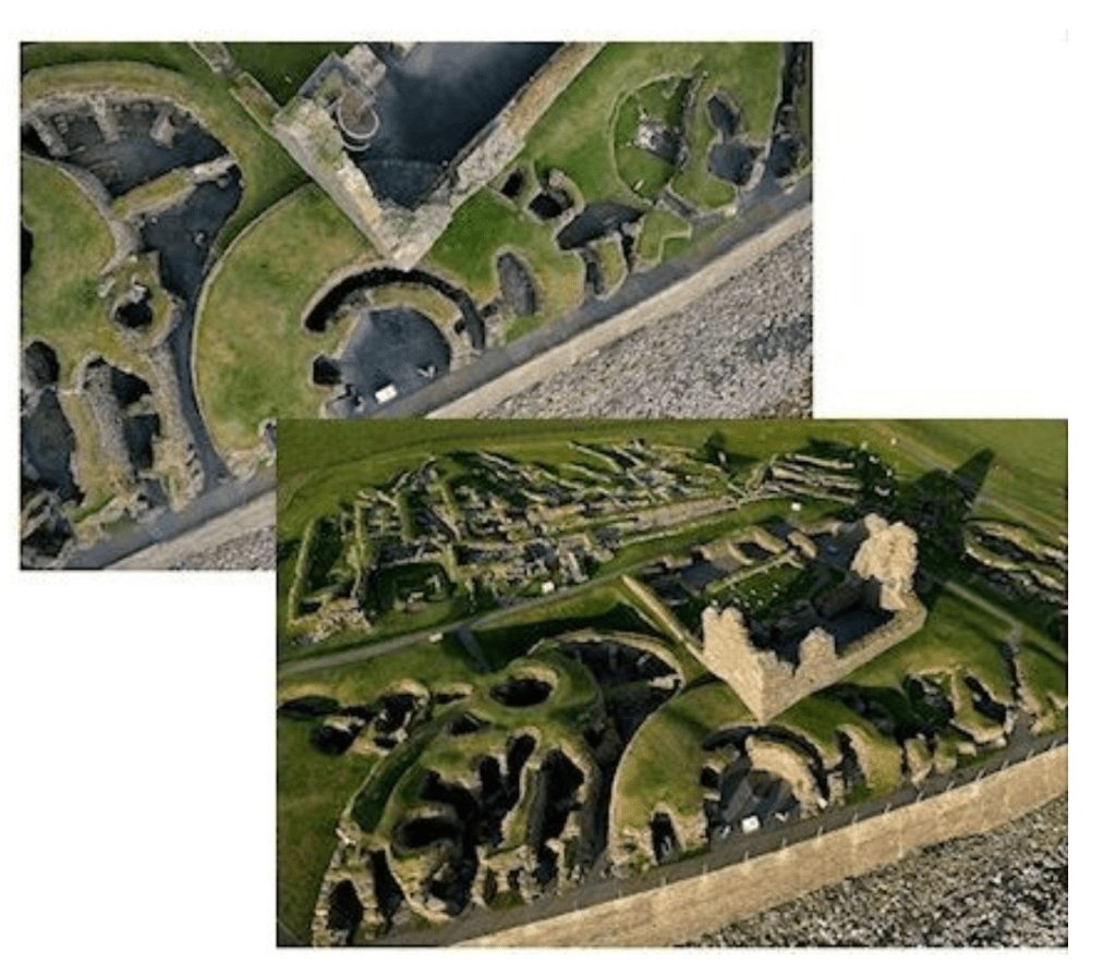 The name Jarlshof, meaning “earl’s house”, was invented by Sir Walter Scott for his novel, The Pirate, jarl meaning earl in Norse. The actual name of the site is Sumburgh, from the Old Norse word ‘borg’, meaning ‘fort’, same as the region. Bronze Age settlers left small oval houses with thick stone walls there. Iron Age ruins include roundhouses and a defensive wall around the site. Picts built a complex of wheelhouses. There’s a Viking longhouse and medieval farmhouse.